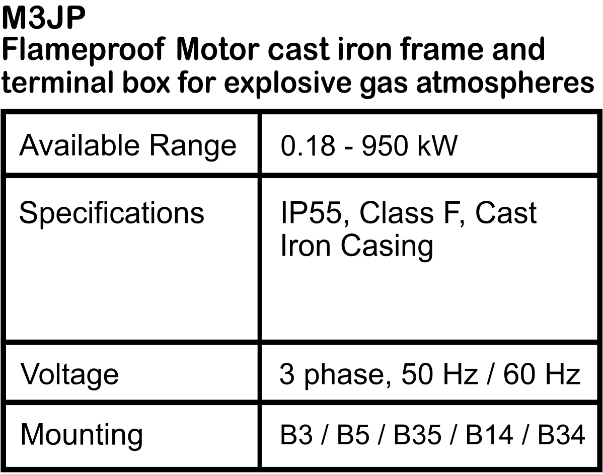 Available Range : 0.18 - 950 kW Specifications : IP55, Class F, Cast Iron Casing Voltage : 3 phase, 50 Hz / 60 Hz Mounting : B3/B5/B35/B14/B34
