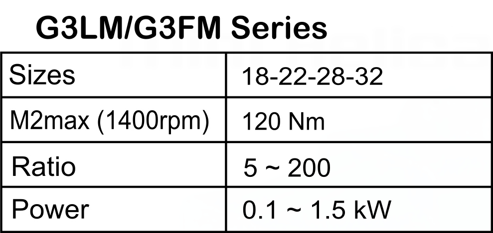 Sizes : 18-22-28-32 M2max (1400rpm) : 120 Nm Ratio : 5 ~ 200 Power : 0.1 ~ 1.5 kW
