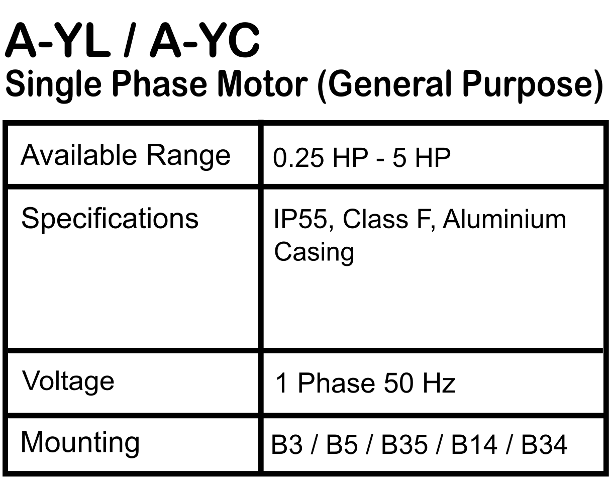 Available Range : 0.25 HP - 5 HP Specifications : IP55, Class F, Aluminium Casing Voltage : 1 Phase 50 Hz Mounting : B3/B5/B35/B14/B34