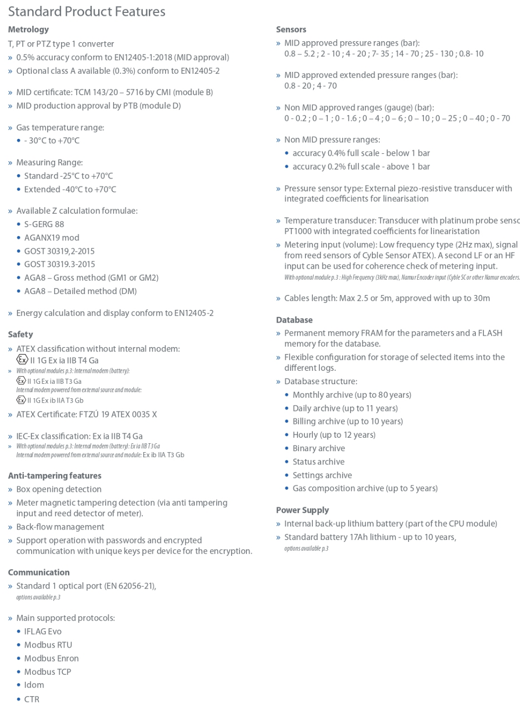 High accuracy: compliant with MID according EN12405-1:2018 (0.5%) with optional Class A accuracy (0.3%) according EN12405-2:2012