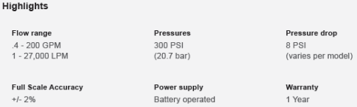 > High accuracy digital paddlewheel technology > 3/8”, 1/2”, 3/4”, 1”, 1-1/2”, and 2” male pipe threads > Tamper proof factory programming > Easy to read 6 digit LCD display, up to 4 decimal places > Very low pressure drop > Total reset function can be disabled