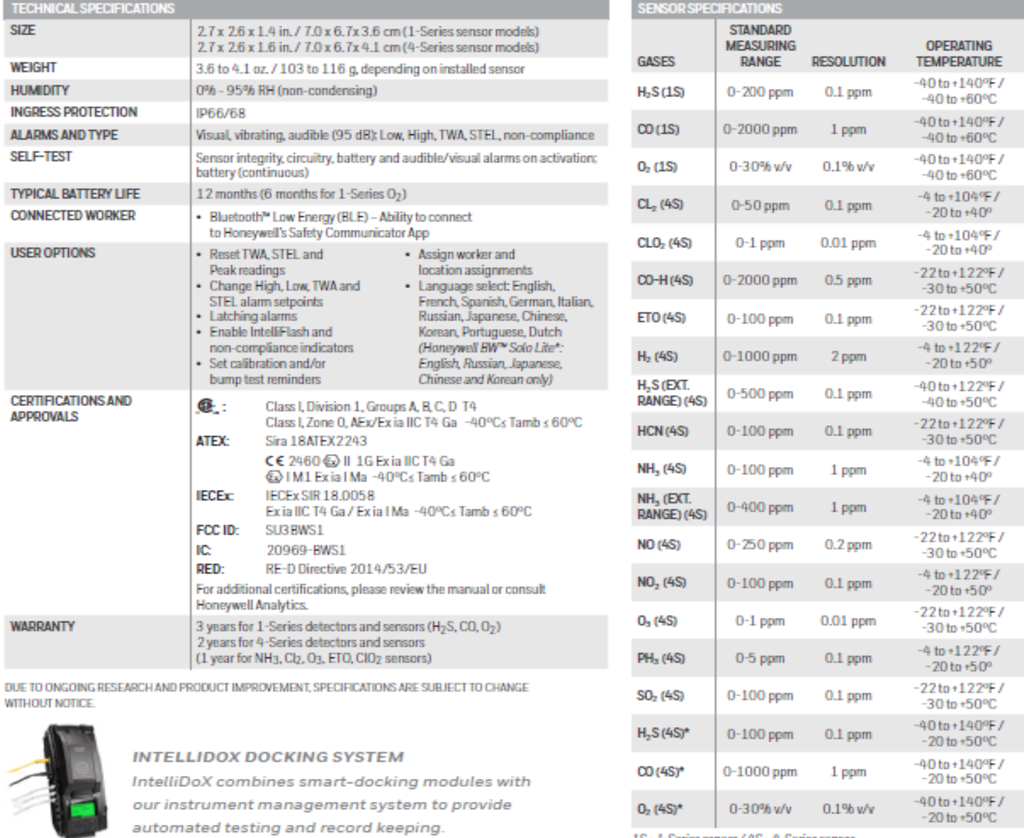• The easiest single-gas detector to service, with no need to take it apart to replace sensors, batteries and sensor filters. That means long life and low cost. • Complete with an extensive selection of sensor options. Count on comprehensive detection, whether you’re monitoring for common or exotic hazards. • The first single-gas detector with the 1-Series sensor for CO, H2S and O2. That means high accuracy, lower costs and faster sensor response time for the gases you monitor most often. • Compatible with IntelliDoX. Save time and centralize data with automated bump testing, calibration and instrument management. Use IntelliDoX docking stations with Honeywell SafetySuite Device Configurator software.