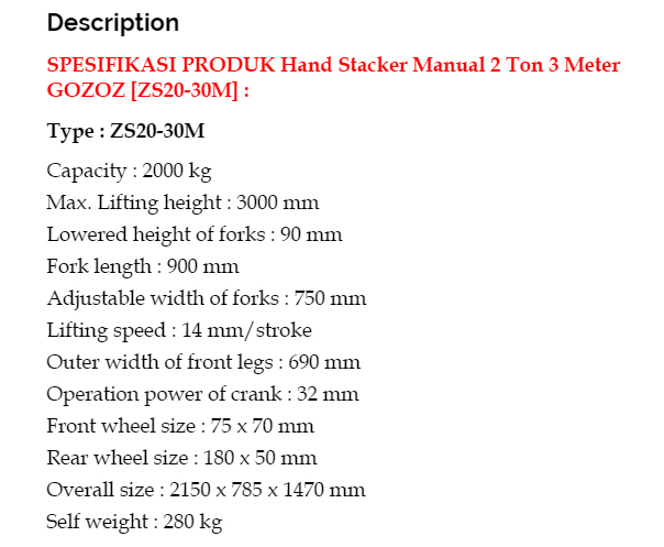Spesifikasi Jual HAND STACKER MANUAL 2 TON 3 METER GOZOZ ZS20-30M