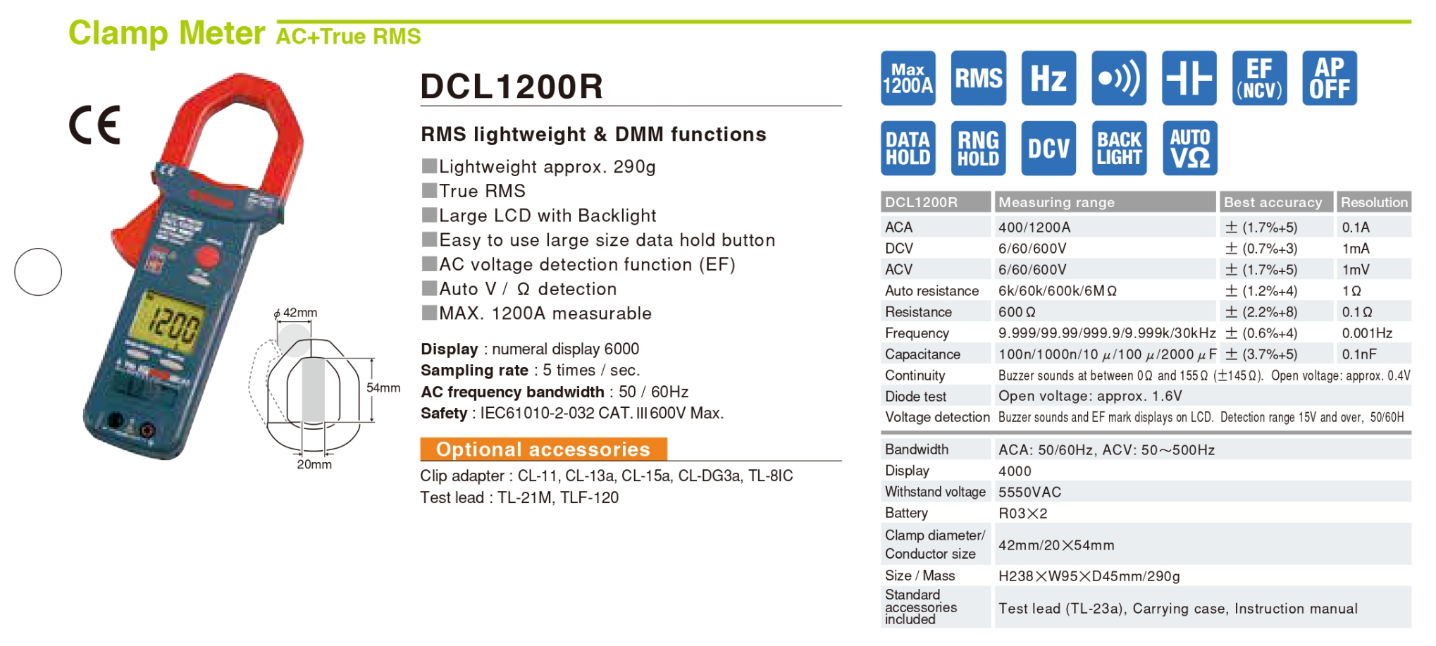 Sanwa Clamp Meter Ac PLlus True RMS Sanwa DCL 1200R