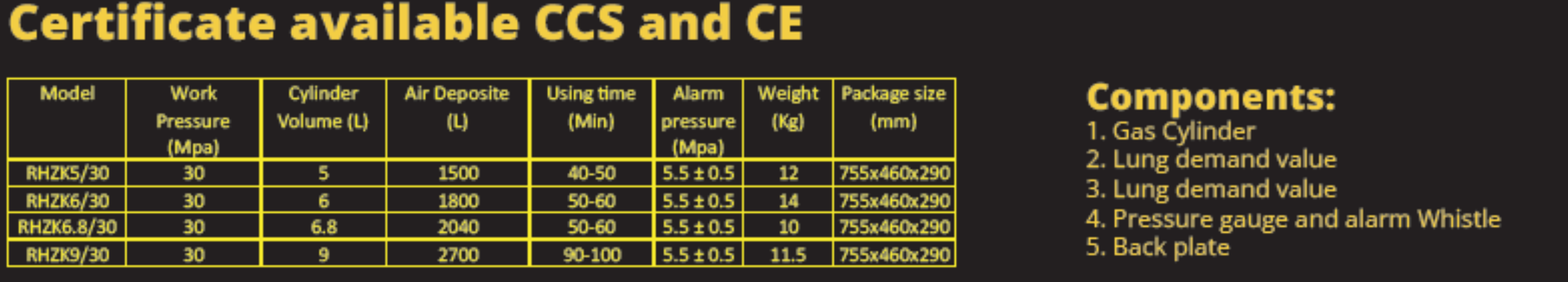 Emergency breathing device is composed of carbon-fiber cylinder/steel cylinder,reducer,supply valve,full face mask,pressure gauge and flame retardant backpack. In accordance with the 2000 Amendments to SOLAS 1974,and international code for fire safety system
