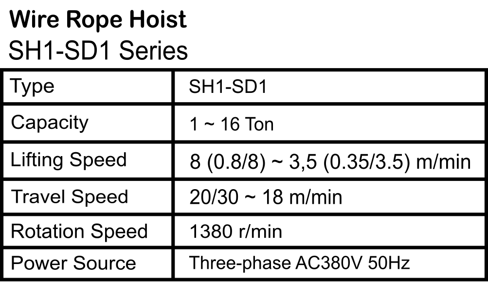 Type : SH1-SD1 Capacity : 1 ~ 16 Ton Lifting Speed : 8 (0.8/8) ~ 3,5 (0.35/3.5) m/min Rotation Speed : 1380 r/min Power Source : Three-phase AC380V 50Hz
